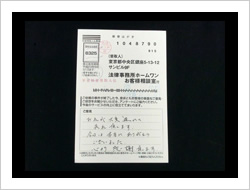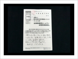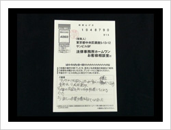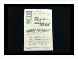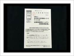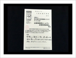 アンケートにも記入したが、(知人に弁護士もいるが)貴所はより応対親切。仕事の内容をよくつかみ判断してくれるので、新しい弁護士像を与えてくれました。