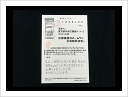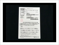 最初は色々不安でしたが、事務員の方や弁護士の方と話して安心して任せる事が出来ました。色々助けて頂きありがとうございました。これからも頑張ってください。