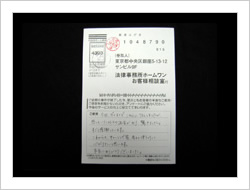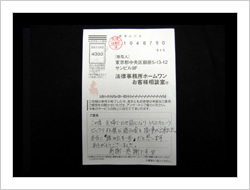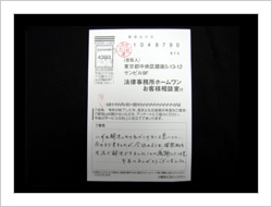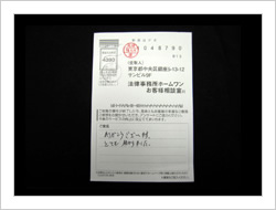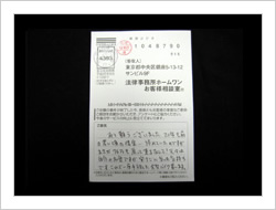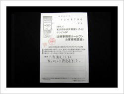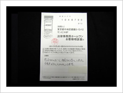 最初依頼するときは、色々考えたり迷ったり不安でしたが電話で話すうちにこれは大丈夫と思うようになって、後は自信も出てきました。そして予定より早く解決していただき感謝いたしております。大変ありがとうございました。