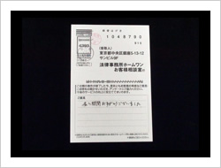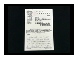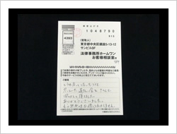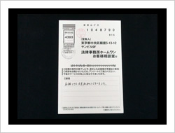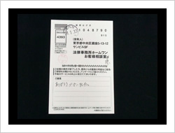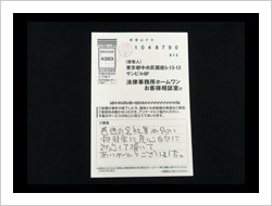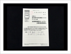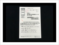 この度は、私事から出た錆のような問題を助けていただきまして、本当に感謝しております。本来ならば私が解決しなければいけないことを、お陰様で本当に心が軽くなりました。本当にありがとうございました。