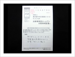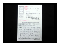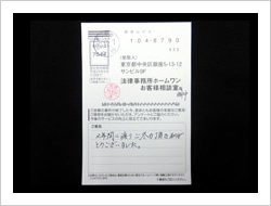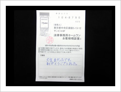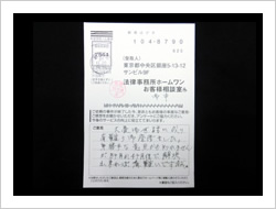 今の度びは本当に有難う御座居ました。先生に相談して良かったです。外で1回有りましたが中間報告とか何もありませんでした。遅く成りましたが本当に有りがとうございました。