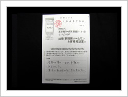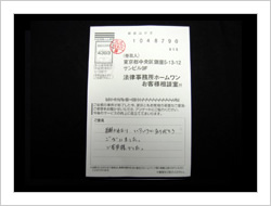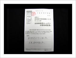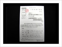 毎日、毎月、絶望の日々を送っておりましたが、ホームワン様のお力で解決して頂きました、希望の人生を送る事ができました。本当にありがとうございました。