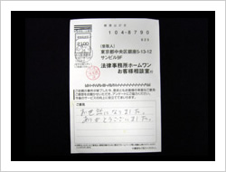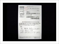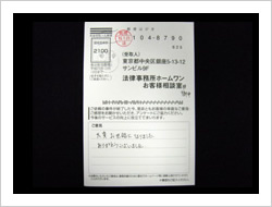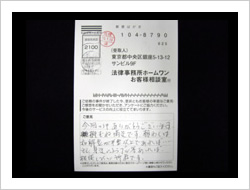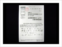この度は本当にありがとうございました!主人が亡くたりこの先どう生活して行けばいいのか悩んでいた時に過払い金に関するテレビコマーシャル心がひかれました。一度はあきらめていたけど、今の生活をどうにかしたいと言う思いでホームワンさんに電話をしました。不安でした。とにかく不安でした。書類提出から次々にホームワンさんから送られてくる返答に安心して行く自分がいました。相談して良かったと心から思っています。息子夫婦にも、ホームワンさんとの事を、話しました。心の荷が軽くなりました。息子達も本当に力になってくれるだねとおどろいていました。
