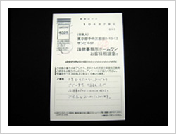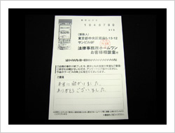 お世話になりました。和解までの流れから支払いスケジュール、計算結果、報告書までわかりやすく記入してあり良く理解することができました。別の法律事務所にもTELしたことがありますが、ガイダンスで流れて何度TELしてもつながりませんでした。ホームワンは直接話ができましたので、ホームワンで良かったと思っています。