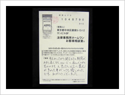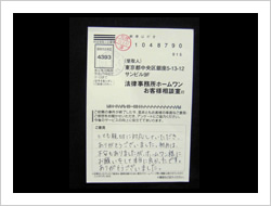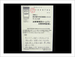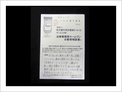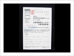 今回の件をホームワンに相談いたしたこと、私にとっては最後の大仕事を思い悩んだ末にホームワンを選び、本当に良かったと思っております。この年齢で解決するまで病気はしないだろうか、又突然死など起こらないだろうかと、日々心配致しておりました。元気で今日の日を迎えられ、また思いがけず過払い金まで頂くことになり、ホームワンのお陰と思っております。御礼申し上げます。本当にありがとうございました。