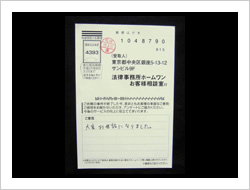 この度の件が無地に終了し、本当にありがとうございました。分かりやすいテレビCMを何度も見ていたので、最初の一歩を踏み出すことが出来ました。お互いに顔が見えていなくても、そちらの誠意が十分に伝わりました。本当にありがとうございました。