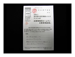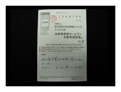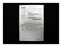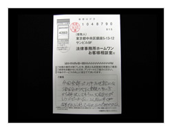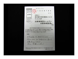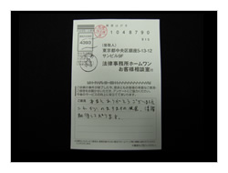 過払金、入金までいろいろやっていただき有りがとうございました。ホームワンさんにお願いしてよかったです。今後又何かありました時はお願いしたいと思っております。ほんとうに有りがとうございました。