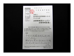 今回全部で3件お世話になり毎回わかりやすく金額の多い方から解決してもらい大変ありがとうございました。こんなに早く結果が出ると思っていなかったので助かりました。