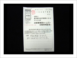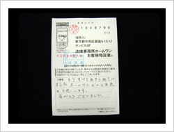今回は、過払金の件でお世話になりました。私が手続きが遅れたにも関わらず親切に対応して下さってありがとうございます。1年程かかると思っていたのに半年もしないうちに、想像以上の返金がありとても嬉しいです。本当にありがとうございました。