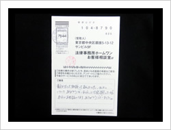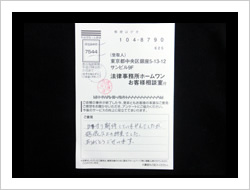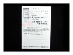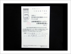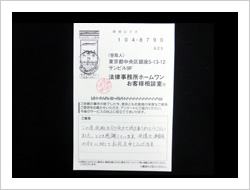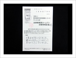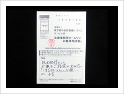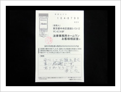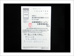 この度、依頼を引き受けて頂きありがとうございました。とても感謝しています。弁護士、事務員の方々に対して、お礼を申し上げます。
