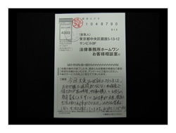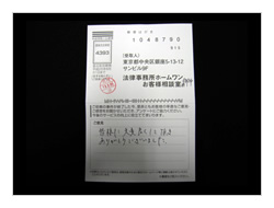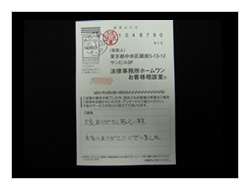 今回は本当にありがとうございました 肩の荷がおりて気分がラクに感じられます 弁護士先生も事務の方もみんな優しく親切で心から安心してお願いできました。また何かトラブルがあったらその際は再び依頼お願いすると思います よろしくお願いします