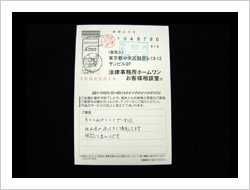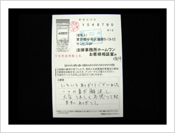 過払い金請求の件で、大変お世話になり感謝してます。弁護士さんに頼むのは、多額の料金がかかるんじゃないか?弁護士さんは難しい法律用語を話をして怖そうで堅苦しい感じがして・・・。敷居が高く相談しづらく思いました。それと、ラジオCMを聴いた時、東京の弁護士事務所が、地方の相談者の相談を、ちゃんと聞いてくれるのか?と思いましたが、何回もCMを聴いていると、ラジオから聴こえた中原先生の声は、とても、優しく、安心出来る感じがしたので、相談する決心が付きました。事務所の対応と、担当弁護士先生の適切な対応と、分かりやすい話し方が、とても良かったです。感謝しています。また、父の交通事故の示談交渉と、示談金の請求金額について相談したいと思いますので、その時は、宜しくお願い致します。