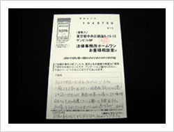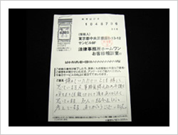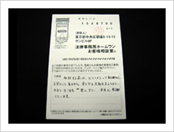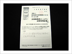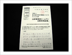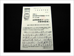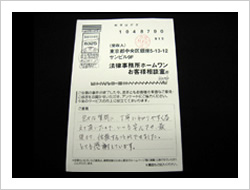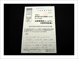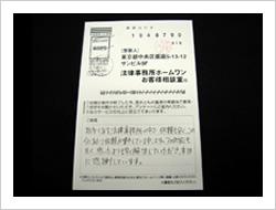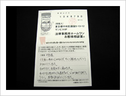 今回はお世話になり本当にありがとうございました。少額でもお受け致しますとの相談係(受付)の方のお言葉でお世話になりましたが、裏面にも書いた様に大口の取引会社の方を他の弁護士さんにお願いして失敗致しました。私のような方がほかにも多くいらっしゃると思いますので、これからも弱者の味方になってがんばってください。ありがとうございました。