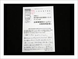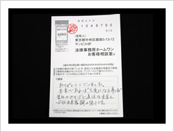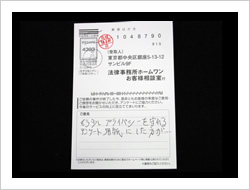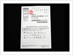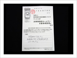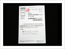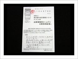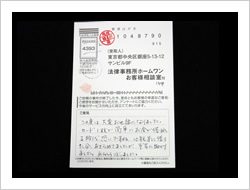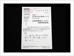 この度は大変お世話になりました。カード1枚で簡単にお金が借りれる時代、恐いですね。10年も前に借りた分、あきらめていましたが、本当に助かりました。ありがとうございました。