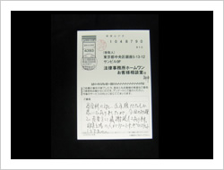 今回は大変お世話になりました。長い間、借金で悩み苦しんでいました。過払い請求という方法を知ってはいましたが、恥ずかしくもあり、なかなか一足踏み出すことができませんでした。もっと早く手続きをすれば良かった。そう思います。ありがとうございました。