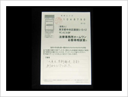 もっと早く相談すれば良かったと思いました。地獄の日々から救って頂き、感謝の気持ちで一杯です。本当にありがとうございました。