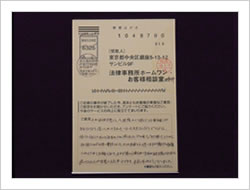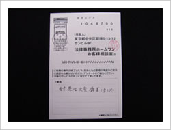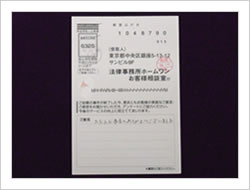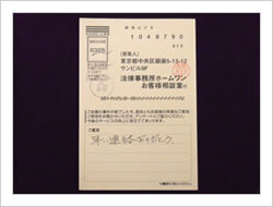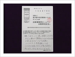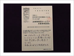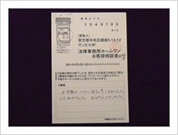 はじめてお世話になりましたが、一切の不安もなく最後まで安心していることが出来ました。相談無料のうえ、もし何もなかったら一切の請求がないとうかがっていたので本当に安心出来ました。どうもありがとうございました。(お客様相談室アンケートにて)