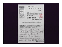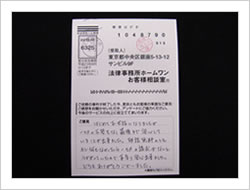 遠く、九州からの依頼にもかかわらず、1年ちょっとの期間で解決していただき、ただ、ただ感謝のみです。自分自身の責任なのです。こういう結果が来るなんて思ってもいませんでした。これからは前向きにいっしょうけんめい働いてがんばっていこうと思います。皆様本当にありがとうございました。