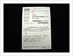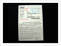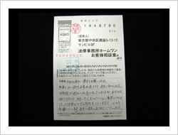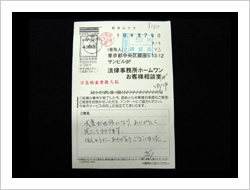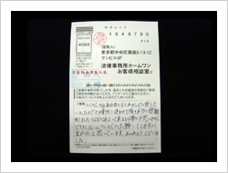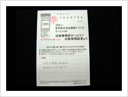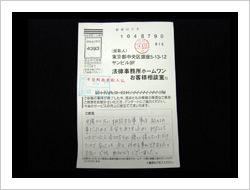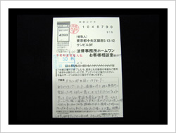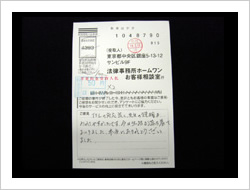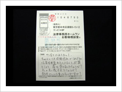 本当に御世話になりました。ありがとうございました。債務の件で、他の事務所に電話した所、対応が悪く、又そうだったらどうしようと思ってなかなか電話する勇気が出ず思い切ってホームワン様に連絡して本当に良かったなあと思っています。対応も良くわかりやすく説明してくれて、面会した時にはなんだかホッとしました。何かあった時には、又、宜しく御願いします。御守りにさせて頂きます。本当にありがとうございました。