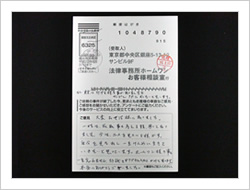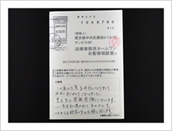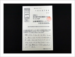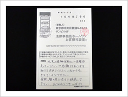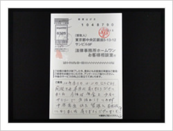 大変お世話になりました。一時は死ぬ事を考える程、困っておりました。今はユメを見ている様です。自分を見なおし一生けんめい生きていきたいと思っています。ホームワン様の事は一生忘れません。ちら紙をガクブチに入れてかけて有ります。本当にありがとうございました。もし東京に行ける様な事がありましたらサンビル9Fによりたいと思います。