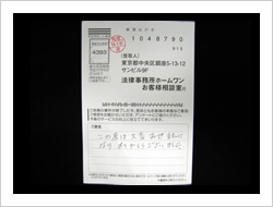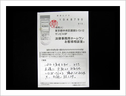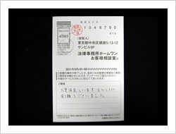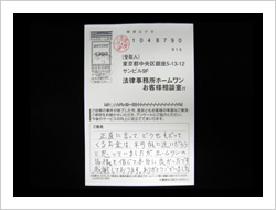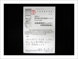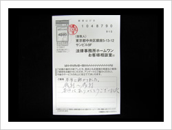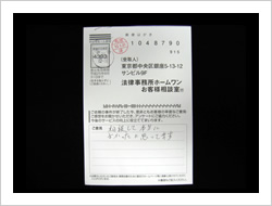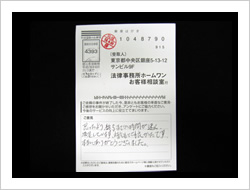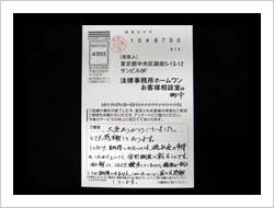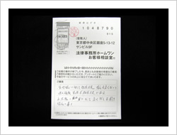 細かな所まで、行き届いた対応と詳しい流れの解る書類の返答で大変、感謝致します。(過払い金の件にて)
