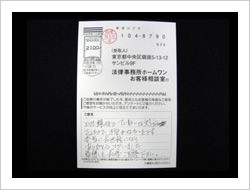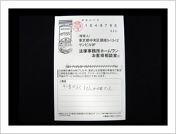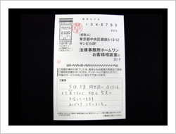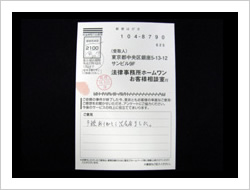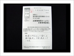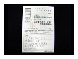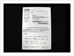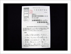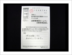 このたびは、大変お世話になりました。弁護士の先生、事務員さんの対応は、とても親切で、良かったです。本当に、ありがとうございました。