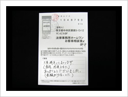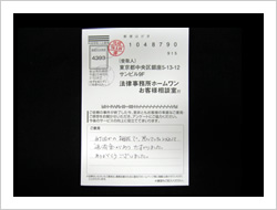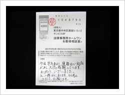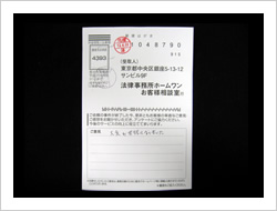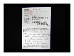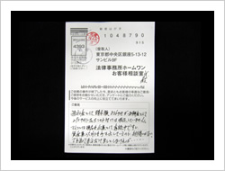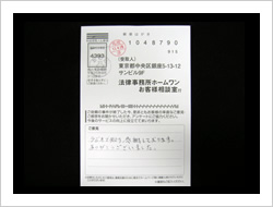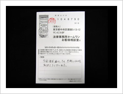 この度は本当にお世話になりありがとうございました。弁護士の方にお願いするというのは私にとってとても勇気のいることでしたが、今は肩の荷が降りてホッとしております。過払い金がこんなに戻ってくるのであればもっと早くにご相談すれば良かったと思いました。