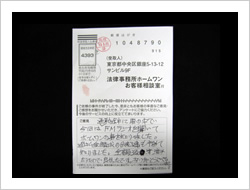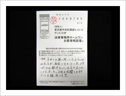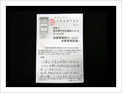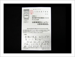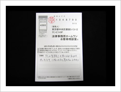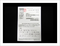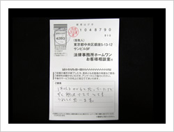 大変お世話になり本当にありがとうございました。当初は法律事務所とは無縁でしたので大変不安でしたが、事務員さん、弁護士さんも親切でやさしくわかりやすく安心して全面的におまかせする事が出来ました。ありがとうございました。