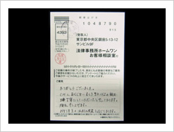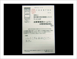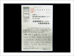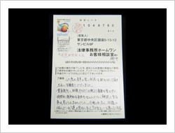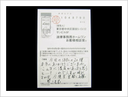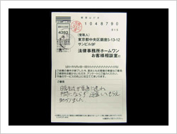 この度は長年の苦い状況を断ち切って頂き本当に有難うございました。貴事務所へ相談するまでは敢えて面談を要さずに時間的、経済的な負担もほとんどなく解決に至る事は考えられませんでした。今後とも広く、同様に悩んでいる人達の窓口になって下さると・・・と思っています。