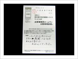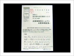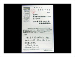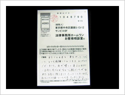ホームワンに相談するまでは、寝るとき、起きても常に借金のことが頭から離れず、仕事、私生活もうまくいかずにいましたが、電話して次の日からは気持ちが楽になり、返済が終わった今は普通に生活が送れるようになり、人生をかえてもらった気がします。ありがとうございました。