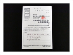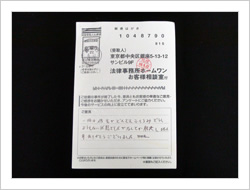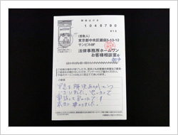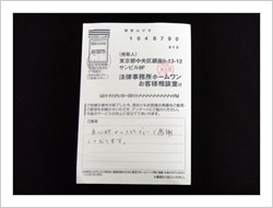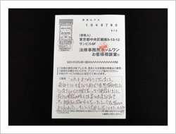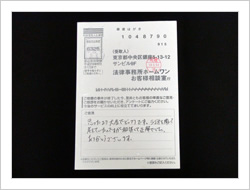 この度はありがとうございました。最初チラシを見てから約5カ月間悩みました。その後TVのCMを見て思いきって電話しました。最初の電話の時、とても安心出来る対応で早く相談すれば良かったと思いました。今後悩みのある方に出会いましたら是非お話しさせていただきます。