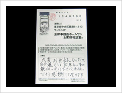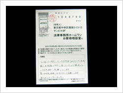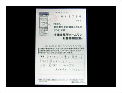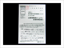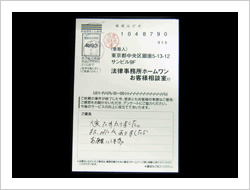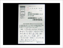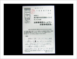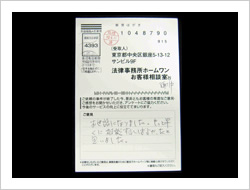 法律事務所の皆様には大変お世話になりました。事件が終了した今はほっとしております。もっと早くに電話相談していればよかったのにと思っている次第でございます・・・。本当にありがとうございました。又お世話様でした。今、心から思っております。