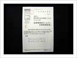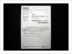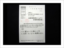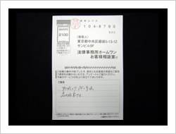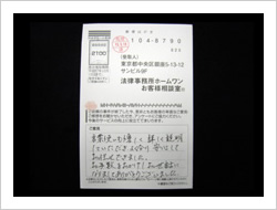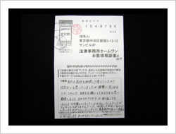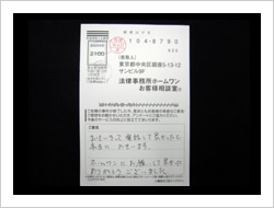 自分は高利も納得して借りていたので仕方ないと思っていましたが、頻繁に流されるコマーシャルで、自分もお願いしてみようかと思い連絡しました。まわりのウワサでは、取り返してもほとんどを弁護士にもっていかれるということでしたがそんなことはありませんでした。相談して本当に良かったと思います。ありがとうございました。貴事務所の益々の発展をお祈り致します。ありがとうございました。
