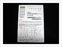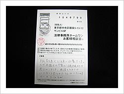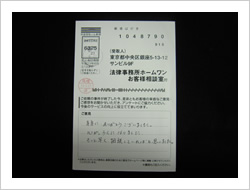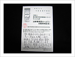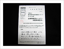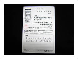 皆様にお世話になり、何もわからない私に、親切にして下さりありがとうございました。何度も、わからない事があると電話で聞き、とても優しくして下さって、借金も早く解決して、今まで悩んでたのがうその様です。やっと安心できます。ありがとうございました。