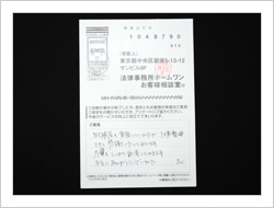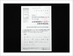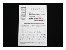 きっかけはラジオです。その後すぐにホームページを見て分かりやすく説明してあったので、他を見ても費用が同じでしたので決めました。最近では悪徳な弁護士もいるとかで不安に思うこともありましたが、実際に請求が止まったのもあり、それだけでもありがたいことと思い、ただ待っていました。ありがとうございました。
