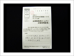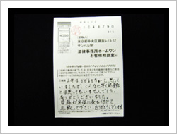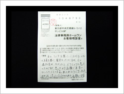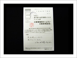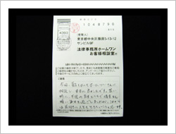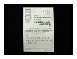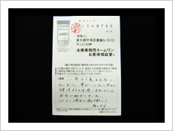 このたびは大変ありがとうございました。長年の悩みが解決して感謝の気持でいっぱいです。お金も返還されて夢のようです。夫に変わって妻の私が代筆です。弁護士さんありがとうございました。感謝