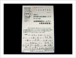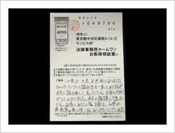 この度は本当に有難うございました。震災後、路頭に迷った私の相談に丁寧に対応していただき、今回に至りました。今後地元に戻り、心機一転頑張って生きていきたいと思います。