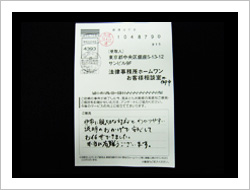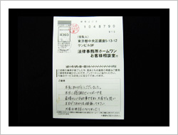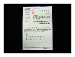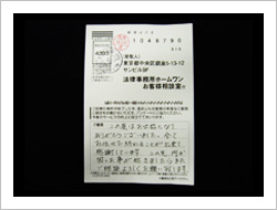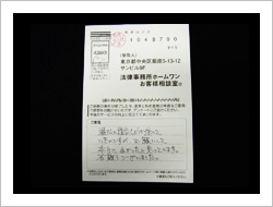 大変お世話になりました。今回で2度目ですが相変わらずきっちり解決して頂いてありがとうございました。今回は多少不満ではありますが悪質業者に一撃与えた事はよかったと思います。この手の業者に涙ながしている人々の為に今後共がんばって笑顔を勝ち取って下さい。