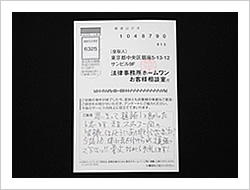 電話するまでが、思い悩みました。弁護士さんの説明で不安がなくなり、今では電話したことを良かったと思います。ホームワンさんのお陰で今まで借りていた借金が返すことが出来、肩の荷がおり何とお礼を言ったらいいのか、感謝しております。ありがとうございました。