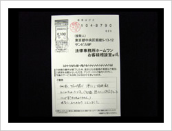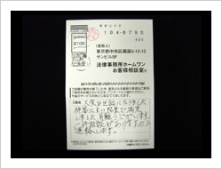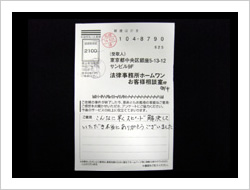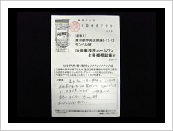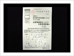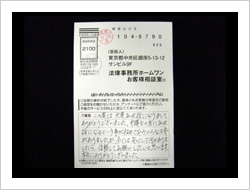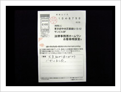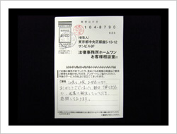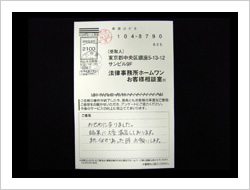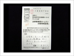 この度は、大変お世話になりましてありがとうございました。弁護士の方にお世話になるという事が初めてでいろいろな不安がありましたが、今では安心して何かありましたら、信頼してお願いしたいと思います。本当にありがとうございました。
