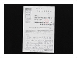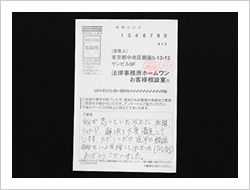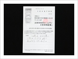 (受任から解決までの流れ)の書類に記入されている期間が過ぎた時は一報いただけると依頼する方も安心できます。こちらが連絡するまで一切ない時は不安でした。結果取り戻せてよかったです。ありがとうございました。