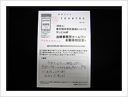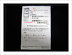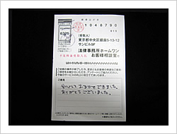この度は過払い金回収の件で迅速な対応をしていただき本当にありがとうございました。心から感謝しております。御社に相談させていただいたことで以前より心にたまっていた気持ちがすっきりいたしました。ありがとうございました。