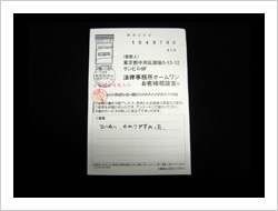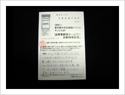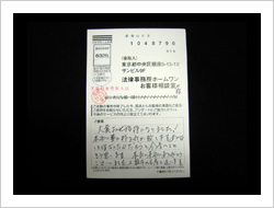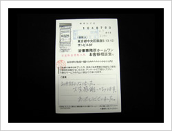 この度はご親切に色々と丁寧にわかりやすく手続きをとっていただき感謝の念でいっぱいです。不安から逃れる生活を営むことができ家族共々幸わせに暮らすことができました。皆様、ありがとうございました。