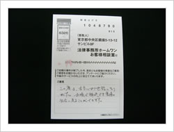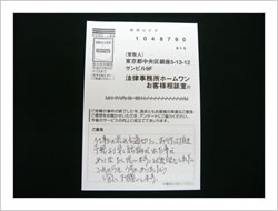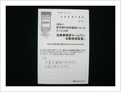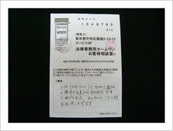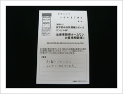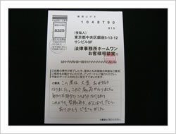 CM(ラジオ・テレビ)で初めて過払い請求が出来るのを知りました。本当に助かりました。ありがとうございます。お礼申し上げます。(お客様相談室アンケートにて)