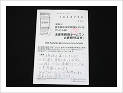 この度は、大変お世話になりありがとうございました。厚くお礼申しあげます。昨年ラジオCMを聴きホームワンに依頼してから『借金のない暮らし』というものがいかに幸せであることに気付きました。十数年間、ずっと返済に追われての生活でしたが莫大な過払い金を取り戻していただき今は夢のようです。こんな日が来るとは思っていませんでした。長い間支払い続きで一生終わる覚悟でした。本当にありがとうございました。また、遠方の依頼による不安など全くなくきちんと対応していただき、解らない部分もきちんとご説明いただき本当に助かりました。