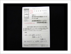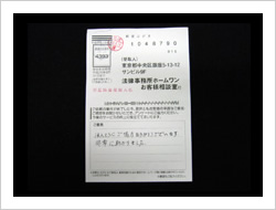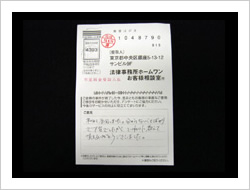 思いもかけず、過払金の返還があり、又スピード処理をいただき誠に有がとうございます。今後もよろしくお願いいたします。
