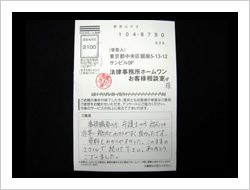 他の事務所では、断わられた案件を対応して頂き、感謝しております。状況をWebでも確認でき、安心してお任せできました。ありがとうございました。