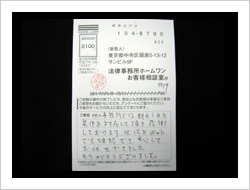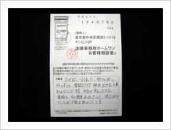 相談前、何度もホームページを見て思い切って相談して良かったです、弁護士の先生、事務員の方の対応も良く安心しました。勇気を持って相談して良かったです。有難うございました。