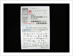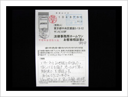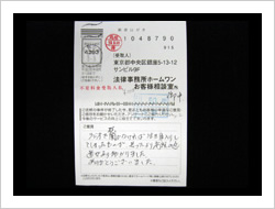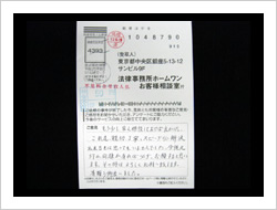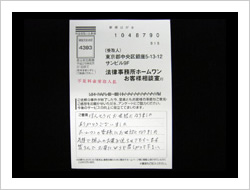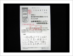 10年前に、離婚した妻が残した問題でしたので、思い出したくない事だったのですが、思い切って、電話して良かったです。特に初めて電話した時の、貴社の対応に感激しました。確か、女性の浜島さんだったと思います。宜しくお伝え下さい。