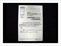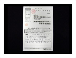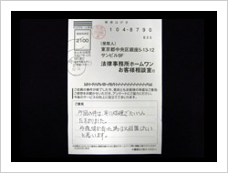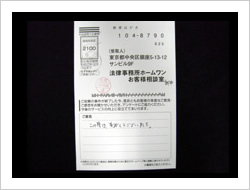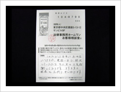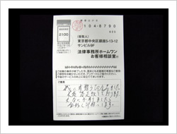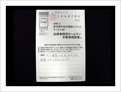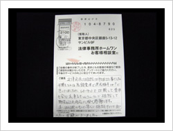 法律関係の相談は初めての事でした。弁護士さんは高額費用と庶民相手は?と思っていましたが、インターネットで比較して費用も安心出来るホームワンにご相談して期待以上の対応に深く感謝します。追いこまれる前にもっと早くご相談すれば良かった。有り難うございました。